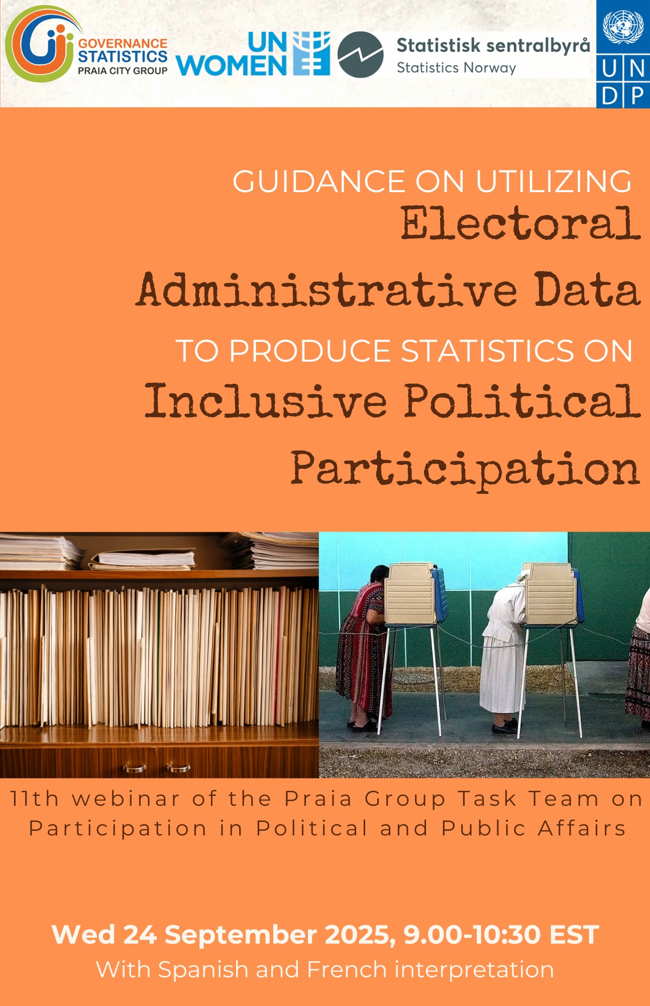 On 24 September 2025, the Praia City Group on Governance Statistics held a webinar organised by the Task Team on Participation in Political and Public Affairs. The webinar discussed the Guidance on Utilising Electoral Administrative Data to Produce Statistics on Inclusive Political Participation, which was developed by this Task Team. The webinar provided an opportunity to: present the structure and content of the guidance; gather participants' feedback and suggestions for improvement.